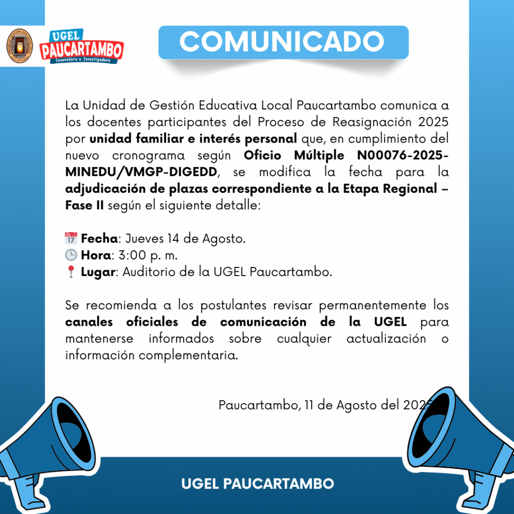 NUEVO CRONOGRAMA – REASIGNACIÓN FASE II Ago 11, 2025 UGEL PAUCARTAMBO 534 Views Share on Facebook Twitter Linkedin